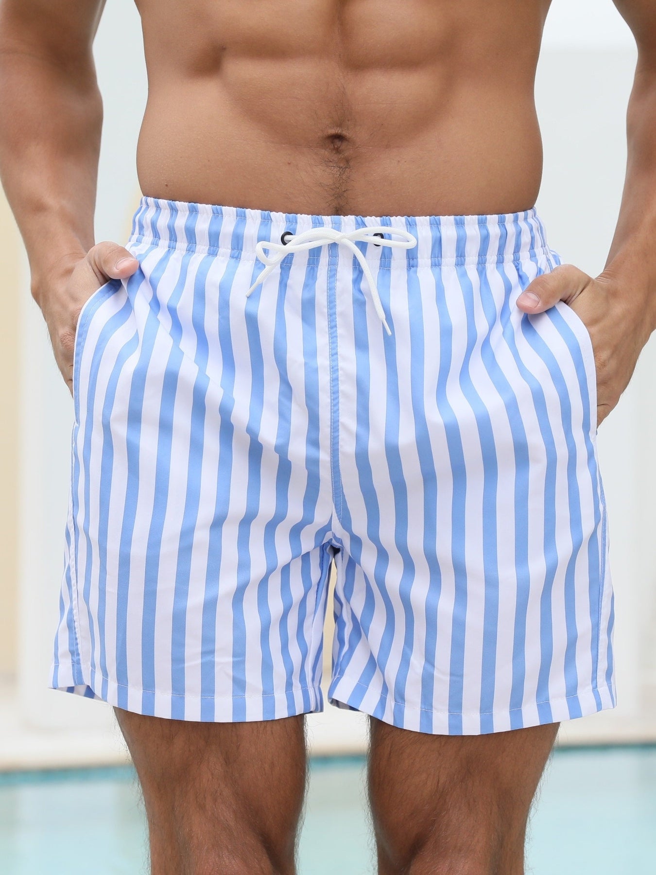 Stilvolle Herren Badeshorts im klassischen Muster mit blau-weißen Streifen. Gefertigt aus leichtem und schnell trocknendem Material, sind sie ideal für Sommertage am Wasser. Die Shorts verfügen über einen elastischen Bund mit verstellbarem Kordelzug, der eine perfekte Passform und hohen Tragekomfort bietet. Seitliche Taschen sorgen für Funktionalität und bieten Platz für kleine Gegenstände. Das klassische Design und das modische Muster machen diese Shorts zu einem unverzichtbaren Teil jeder Sommergarderobe.