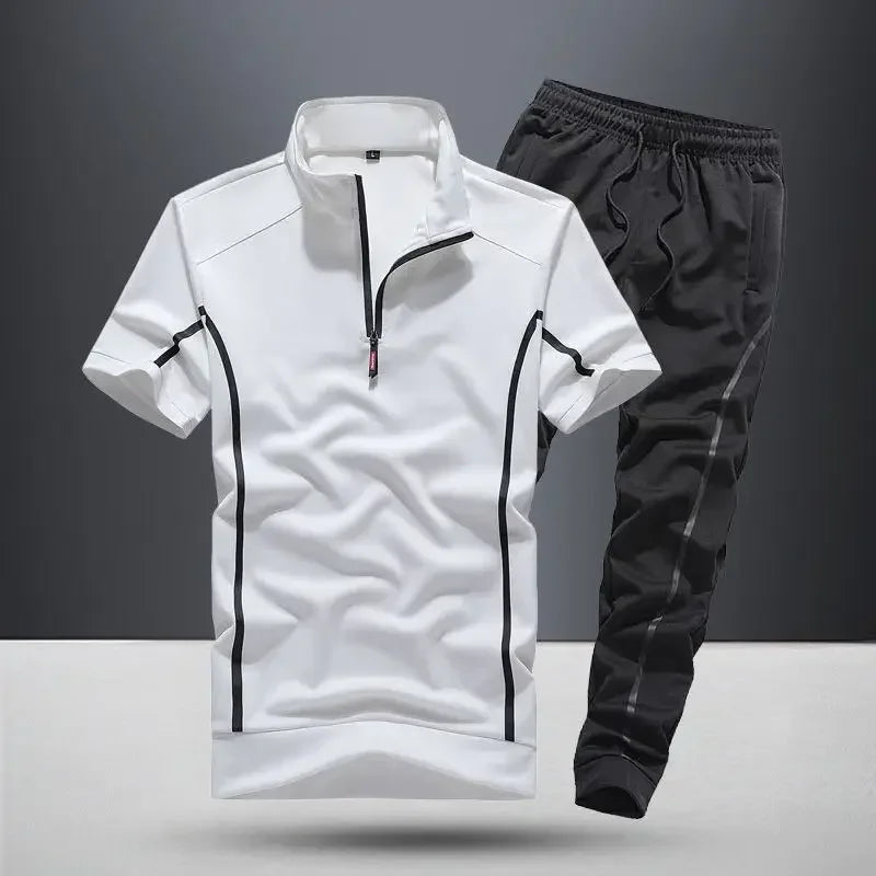 Funktionelles und stilvolles Herren Sport-Set bestehend aus einem Kurzarm-Shirt und bequemen, langen Hosen. Das Shirt hat einen Reißverschluss am Hals, der das Anziehen erleichtert und zusätzliche Belüftung bei intensiven Workouts bietet. Die Hose ist mit einem elastischen Bund und verstellbaren Kordeln ausgestattet, die eine perfekte Passform und hohen Tragekomfort gewährleisten. Das Set eignet sich ideal sowohl für das Fitnessstudio als auch für alltägliche sportliche Aktivitäten.